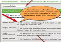 - oder gibt den Datensatz an die*den Studierende*n zurück durch Wegnahme des Häkchens bei "Freigabe AutorIn" (siehe Screenshot).