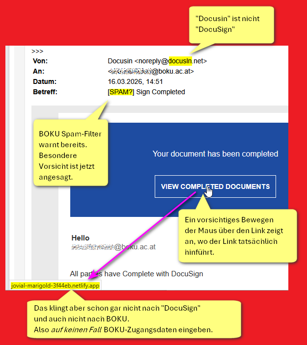 - Wenn Sie ein Phishing-Mail erhalten, das angeblich von der BOKU stammt, und hier noch NICHT gelistet ist, leiten Sie das Mail bitte mit einem