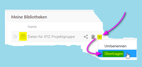Hinweis: Sobald Sie die Eigentümerschaft für eine Ihrer Bibliotheken übertragen, verlieren Sie mit diesem Schritt den Zugriff auf diese Bibliothek, auch den Lesezugriff.