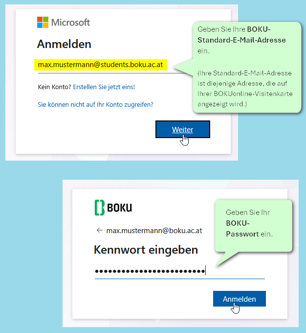 Für das Anmelden in M365 verwenden Sie bitte immer Ihre Standard-E-Mail-Adresse. Das ist die E-Mail-Adresse, die auf Ihrer BOKUonline-Visitenkarte angezeigt wird.