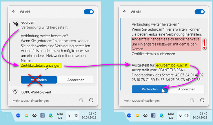 - Achten Sie darauf, dass als Inhaber steht: eduroam.boku.ac.at