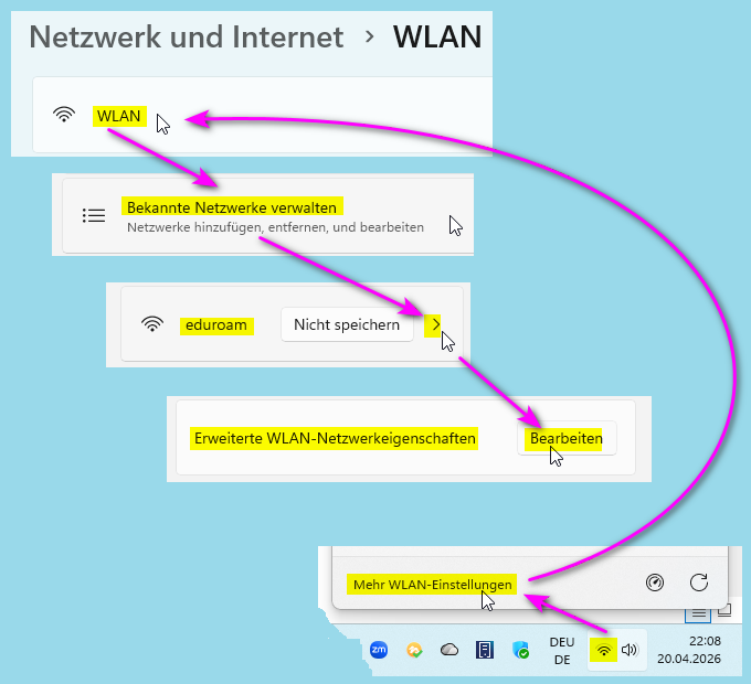 Einstellungen > Netzwerk & Internet > WLAN > Bekannte Netzwerke verwalten > eduroam > Erweiterte WLAN-Netzwerkeigenschaften Bearbeiten