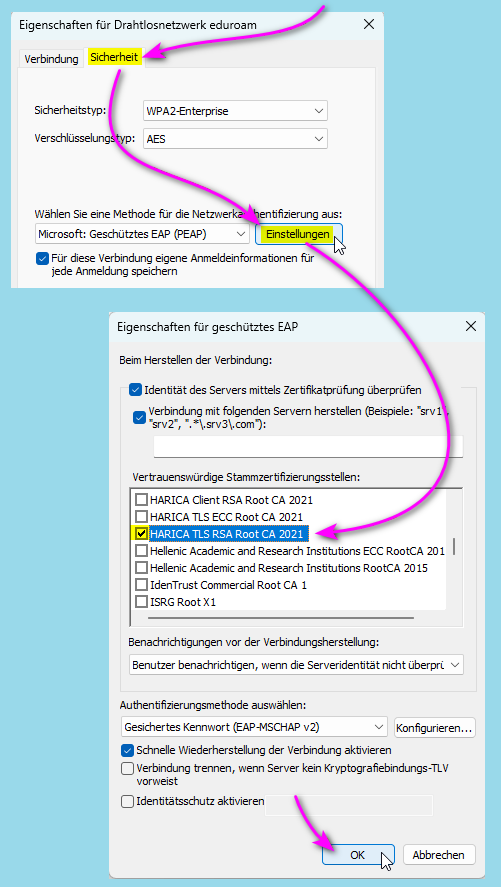 - Wählen Sie folgende Vertrauenswürdige Stammzertifizierungsstellen aus: "HARICA TLS RSA Root CA 2021".