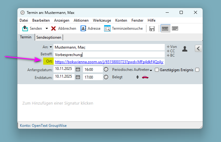 Wenn Sie einen GroupWise-Termin erstellen, ist das Feld ‘Ort’ ein idealer Platz für den Meeting-Link.