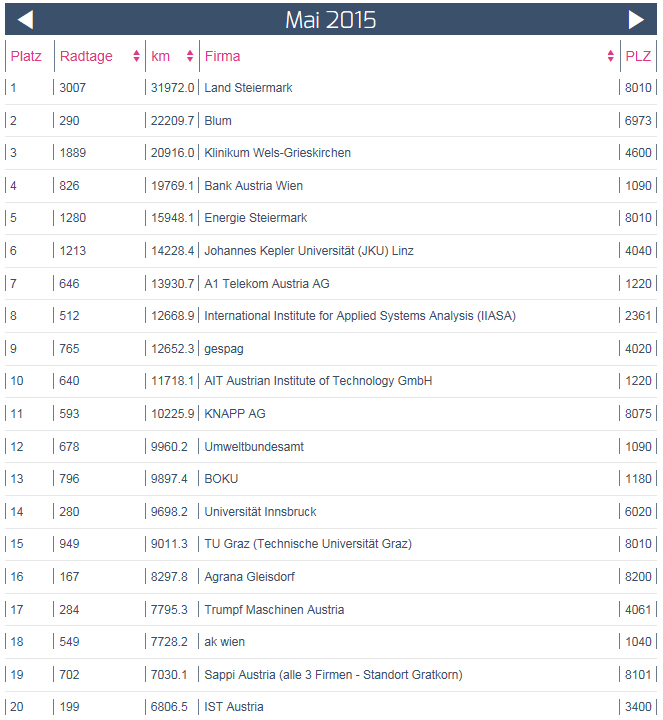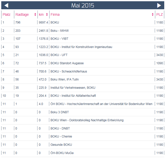 Ein bewegter Monat ist vorbei, viele Geschenke wurden durch sportliche Leistungen gewonnen, viele Tonnen CO2 konnten eingespart werden. Insgesamt haben 110 Angehörige der Universität für Bodenkultur im Monat Mai Kilometer für die BOKU erradelt. Neben der "Firma" BOKU wurden viele weitere Firmen gegründet, welche zwar den Namenszusatz BOKU in sich tragen, jedoch bei der Auswertung der Ergebnisse nicht zum Gesamtergebnis der BOKU beitragen.