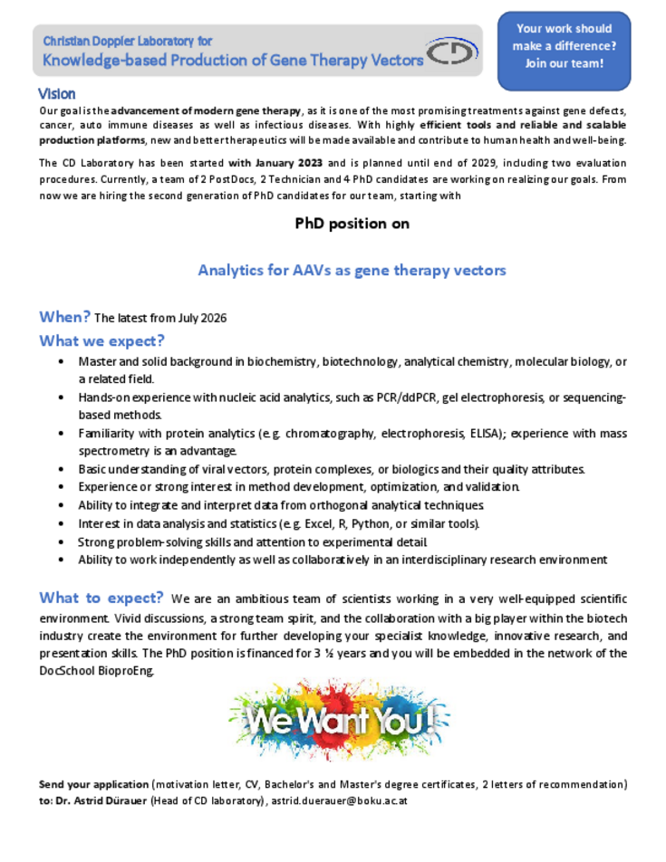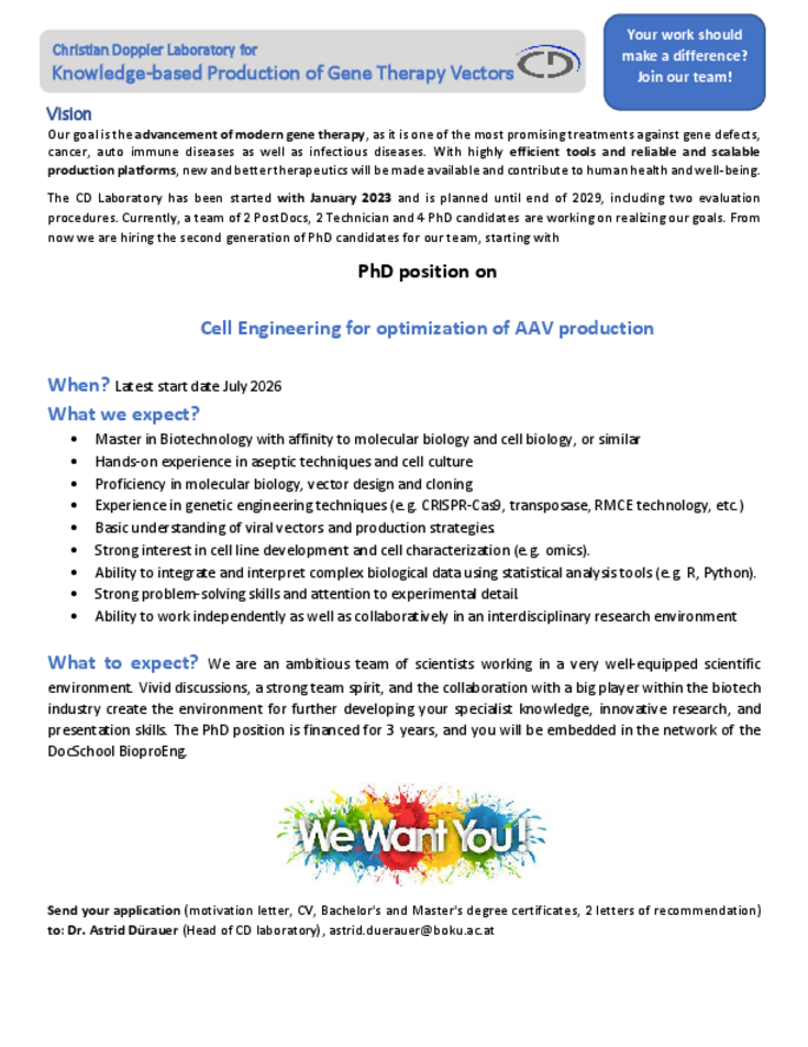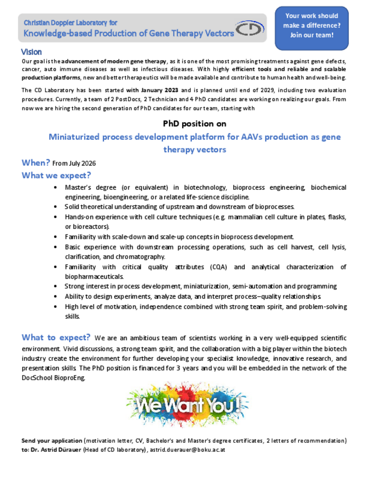 Jobs BOKU-StartDepartment für Biotechnologie und LebensmittelwissenschaftenInstitut für BioverfahrenstechnikJobs Diese Seite ist erreichbar unter: https://boku.ac.at/btlw/ibse/jobs https://short.boku.ac.at/e6rd6z The Insitute of Bioprocess Science and Engineering currently offers the following positions: PhD positions Master Thesis