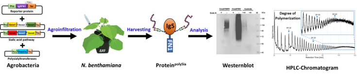 The schematic presentation of polysialylated glycoprotein production in plants: The colored block diagrams of DNA constructs with reporter protein, sialic biosynthetic pathway genes (1-6), and polysialyltransferase. delivering genes to Nicotiana benthamiana by Agrobacterium infiltration to transiently express the constructs to produce protein carrying polysialic acid. Western blot image with anti-polySia antibody showing polysialic acid signal. The chain-length analysis by HPLC reveals degree-of-polymerization peaks, annotated as DP 10, DP 20, DP 30, and DP 40.