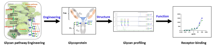 The workflow of the plant-based engineering approach to produce glycoproteins and study structure-function relations: On the left, a green plant leaf diagram labeled with pathway components. In the center, a protein structure carrying glycans. To the right, a chromatogram plot with peaks showing the glycan profile, followed by a graph showing a curve with increasing signal across concentrations of receptor binding.