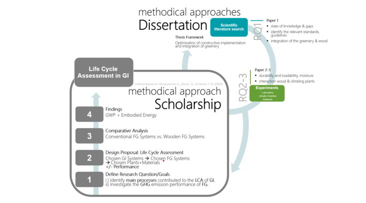 This PhD investigates how vertical greenery can be reliably integrated into timber buildings to advance urban green infrastructure and climate adaptation. Addressing a documented gap in guidance for greening wooden facades, the project examines the mutual effects between climbing plants, wooden climbing aids, and timber facade systems in terms of durability, moisture performance, and structural loading. The research combines: (1) analysis of historical and aged timber structures with greenery to translate proven construction techniques into contemporary timber applications; (2) experimental and/or monitored studies of plant–wood interactions, including moisture dynamics, shading, and mechanical protection; (3) assessment of the contribution of climbing plants to extending service life of timber elements; and (4) a cradle-to-grave Life Cycle Assessment comparing a vertical greening system, including. Outcomes will include performance benchmarks and design recommendations for ground- and pot-based climbing-plant systems on timber façades, demonstrating when and how green facades can enhance building longevity while reducing environmental impacts. The work aims to provide actionable evidence for resilient, low-carbon urban design by coupling sustainable timber construction with nature-based solutions.