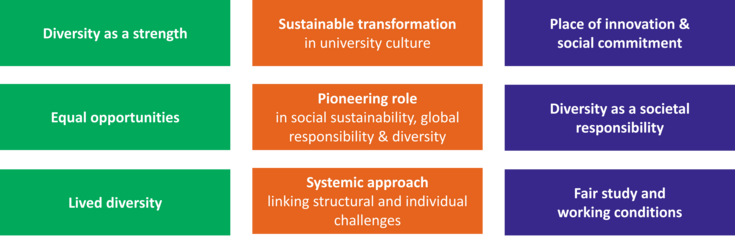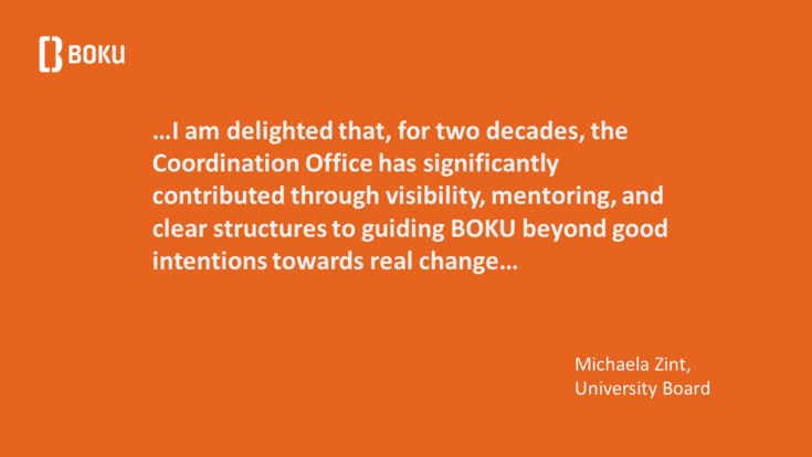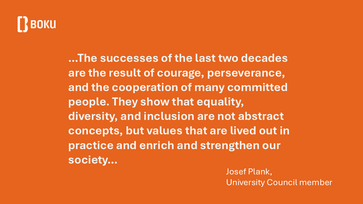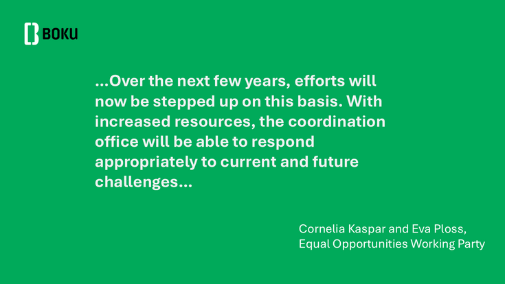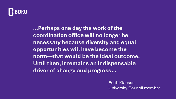 The diversity strategy of BOKU University was developed through a participatory process, based on a draft prepared by the Diversity Steering Group and with the involvement of key stakeholders (such as the Working Group on Equal Treatment Issues, staff representatives of both general and academic personnel, the Ethics Platform, the Students’ Union of BOKU University, the Senate, and the University Council).