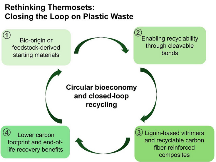 Accumulation of plastics in the environment constitutes a major global challenge. Many high-performance polymers such as epoxy thermosets show very limited degradability thanks to their highly crosslinked structures and lack the ability to decompose. Hence, these materials are disposed of in landfills at the end of their service life since their recycling is unfeasible. Most plastics are still produced from fossil-derived resources while the development of bio-based materials lags behind. This dissertation addresses these problems by adopting the concepts of circular bioeconomy and closed-loop recycling. Recyclability and reprocessability of thermosetting materials are achieved through introduction of cleavable bonds into the polymer network. My research focuses on synthesis of lignin-based vitrimers and production of carbon fiber-reinforced composites using bio-based polymer resins. Pursuing this approach might potentially lead to materials with reduced carbon footprint.