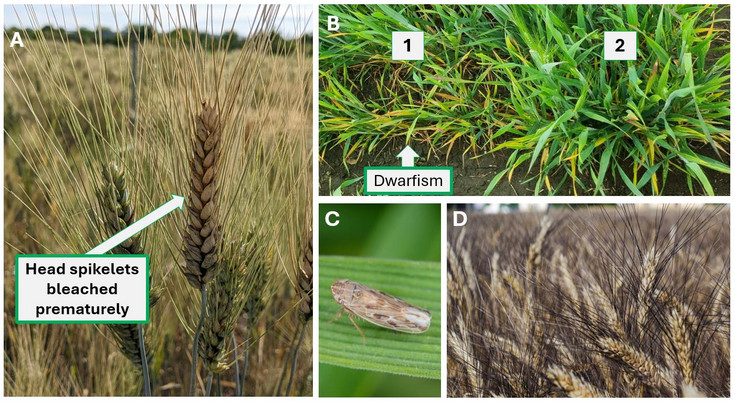 Figure: (A) Fusarium head blight symptoms, Head spikelets bleached prematurely, Portions of ears scalded with a pink-orange coloration. (B) Wheat dwarf virus symptoms 1: Infected plant 2: Healthy plant, (C) Wheat dwarf virus vector: The leafhopper Psammotettix alienus, (D) Sambadur (from Saatzucht-Donau), variety with a robust resistance to WDV.