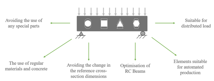 The research has two main objectives: understanding the behavior of optimized reinforced concrete (RC) beams with different void shapes under loads and developing a simplified strategy for their topology optimization. The study excludes special parts, uses regular concrete, and focuses on RC beam construction elements for direct applicability. Components chosen must be suitable for automated production and withstand distributed loads. Figure 1 summarizes the boundary conditions.