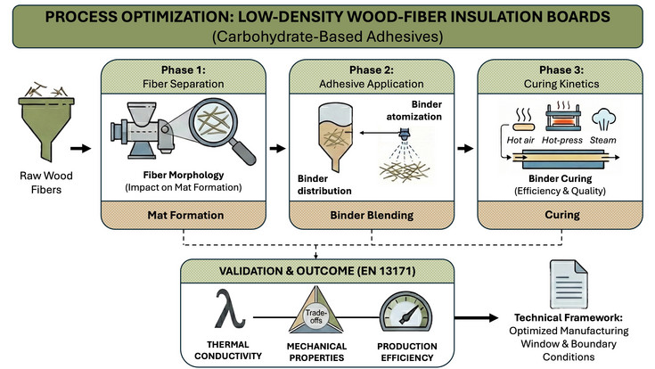 The transition to carbon-storing building materials is currently limited by the reliance of wood-fiber insulation on fossil-based synthetic binders. This research addresses the challenge of replacing conventional resins with sustainable carbohydrate-based thermosetting adhesives within the dry-process production chain. The core hypothesis is that synthetic binders can be effectively substituted through a targeted optimization of the manufacturing parameters to accommodate the specific behavior of carbohydrate-based chemistry.
