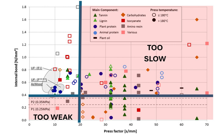 Fig. 1 Overview of the internal bond strengths as a function of pressing factor for adhesives used for particleboard manufacture [1]
