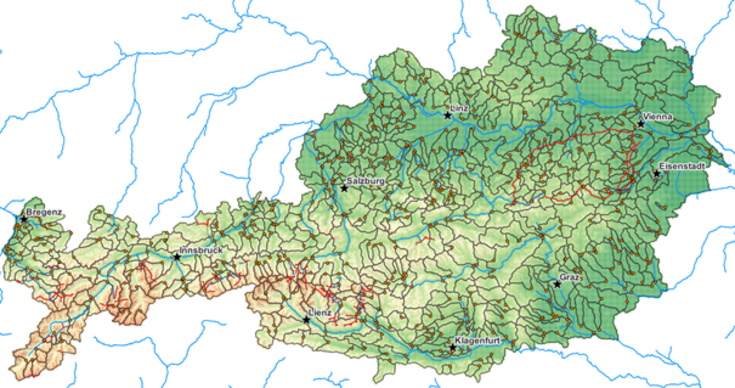 Figure 2. Modeling domain of the Austrian-wide COSERO model, including the 630 LamaH basin borders and gauging stations (Klingler et al. 2021).