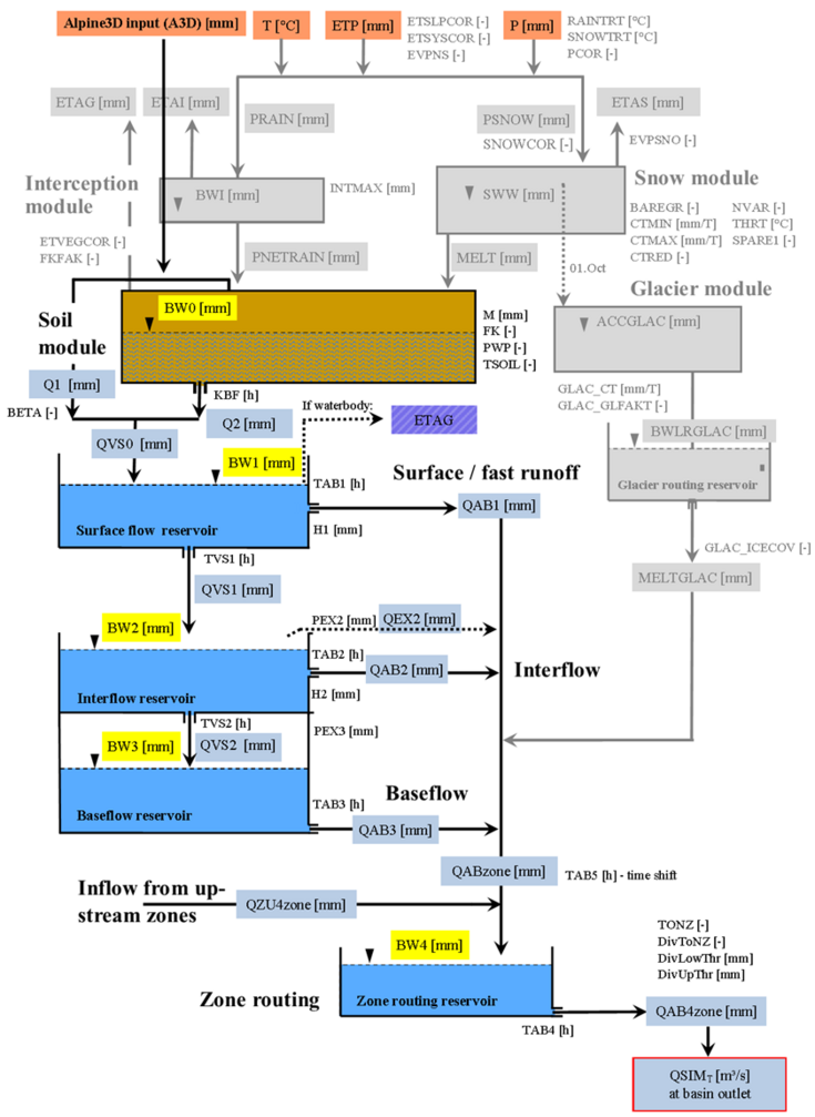 Figure 1. The COSERO and coupled COSEROxAlpine3D schematic overview, including model parameters, system states and fluxes. The grey components are not active in the coupled version. Instead, Alpine3D covers the modeling of snow and glacier processes and the output is provided as a new input to the modified COSERO.
