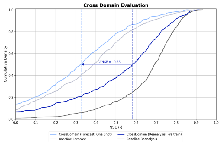 Figure 2: Cumulative Density Function of Nash Sutcliffe Efficiency values for a Cross Domain Evaluation Experiment, depicting the bias propagation from meteorological forecasts in flood forecasting deep learning models. The comparison includes a Pre trained model on five meteorological reanalysis variables (dark blue), a One Shot (direct application without fine-tuning) based on the weights of a Pre trained model with equal five meteorological forecasting variables and baselines (grey). The vertical dashed lines depict the median NSE for each experiment. The blue arrow shows the performance decrease at median NSE when applying cross domain evaluation. (Konold et al., 2025)