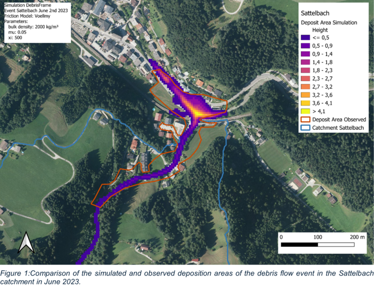 Figure 1:Comparison of the simulated and observed deposition areas of the debris flow event in the Sattelbach catchment in June 2023.