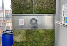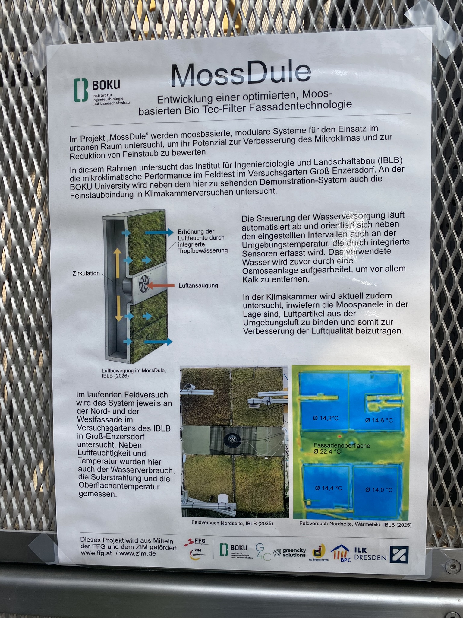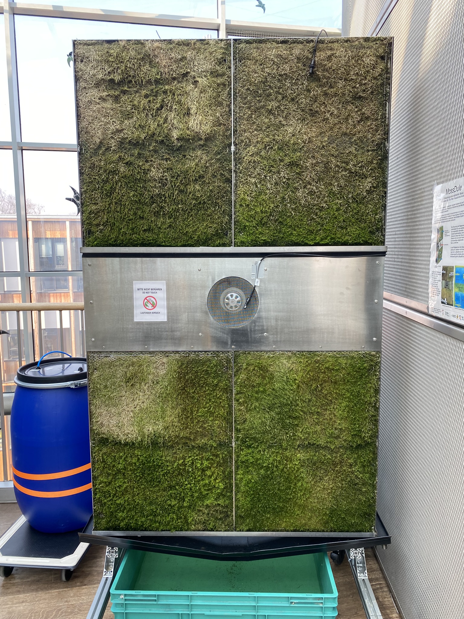 As part of the research project ‘MossDule: Development of an optimized, moss-based biotech filter facade technology’, a pre-prototype for indoor use is being tested at BOKU University. For this purpose, a test stand was set up on the third floor of the Franz-Schwackhöfer-House. Its operation will now be monitored for three months, logging its functionality and performance, as well as maintenance requirements in terms of water consumption and manpower. The monitoring phase will show under which condition and effort vertical walls with mosses can be used sustainably as indoor biological particle matter filters.