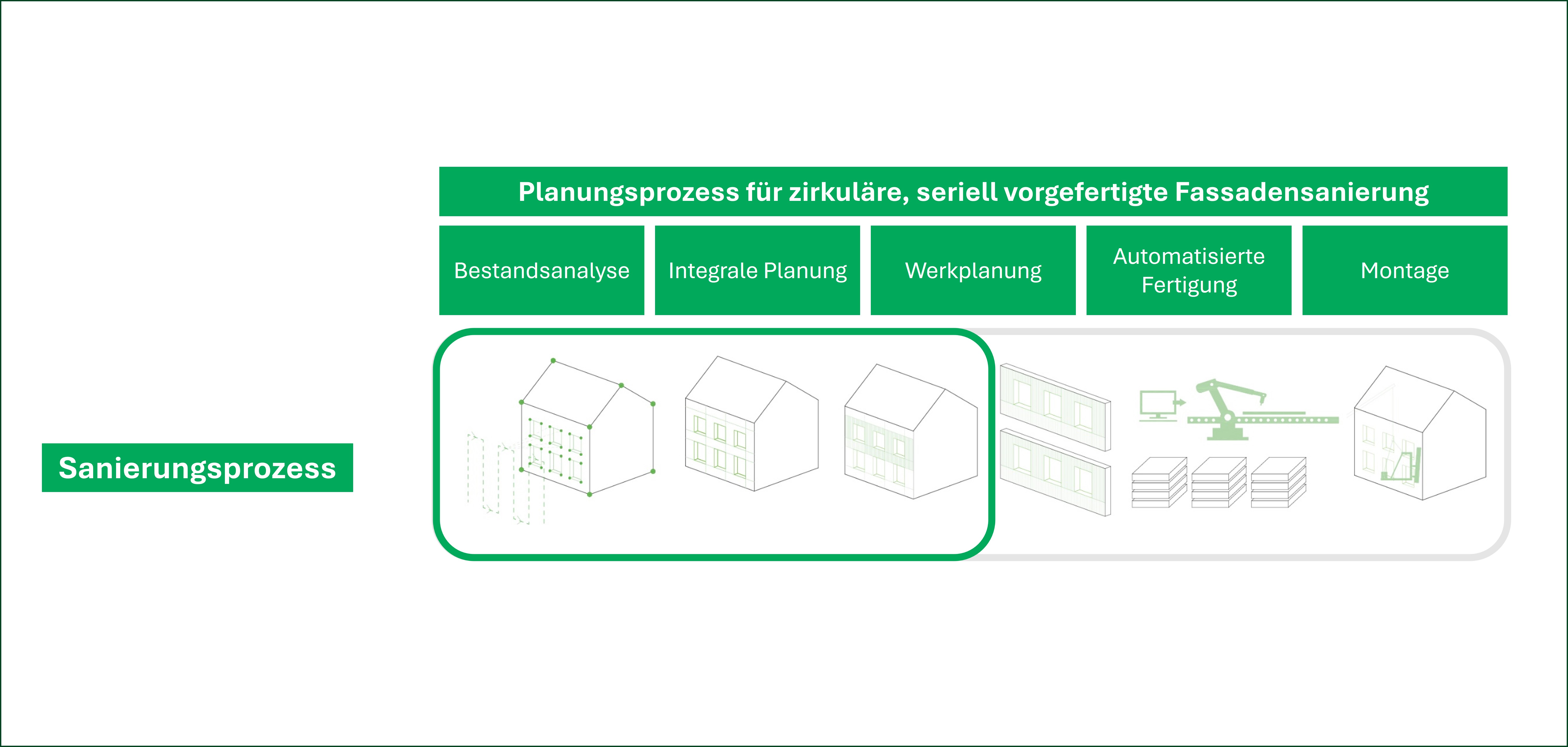 The research project “Prefab.Facade – Performance enhancement of recyclable, serially prefabricated facade elements” pursued the goal of creating the basis for the development and large-scale implementation of modular timber frame systems for renovation that can be manufactured as part of a prefabrication process. The focus was on achieving the highest possible degree of prefabrication, a continuous digital process chain from planning to production and assembly, and the ecological and economic optimization of the systems.
