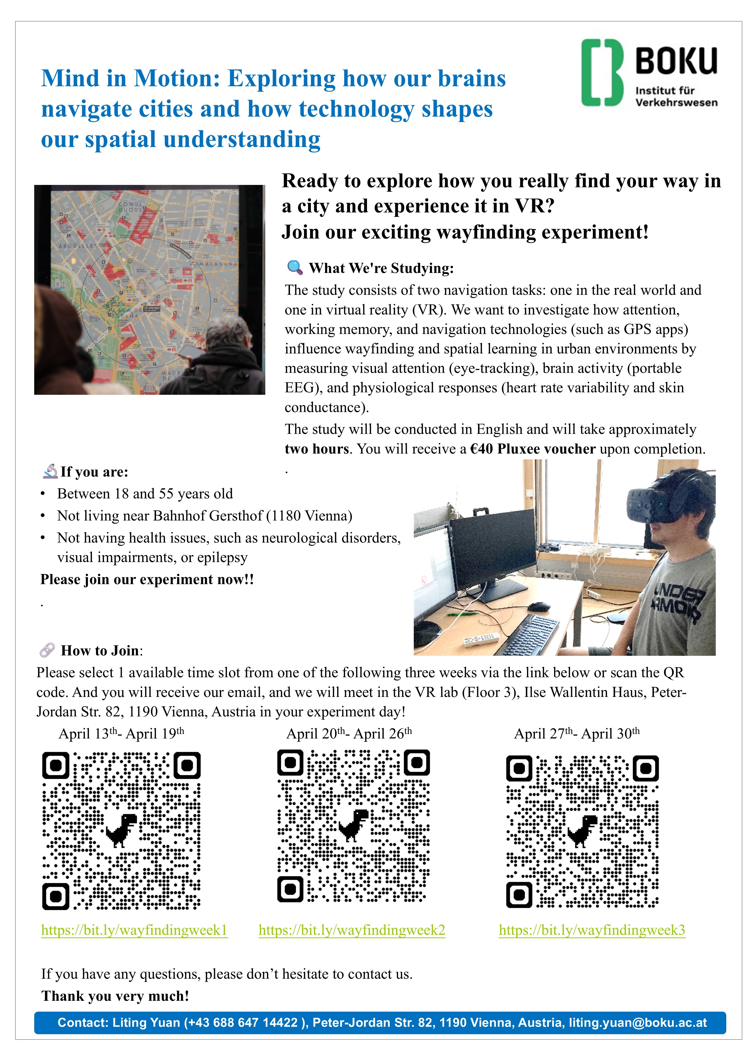 Please select 1 available time slot from one of the following three weeks via the link below or scan the QR code. And you will receive our email, and we will meet in the VR lab (Floor 3), Ilse Wallentin Haus, Peter-Jordan Str. 82, 1190 Vienna, Austria in your experiment day!