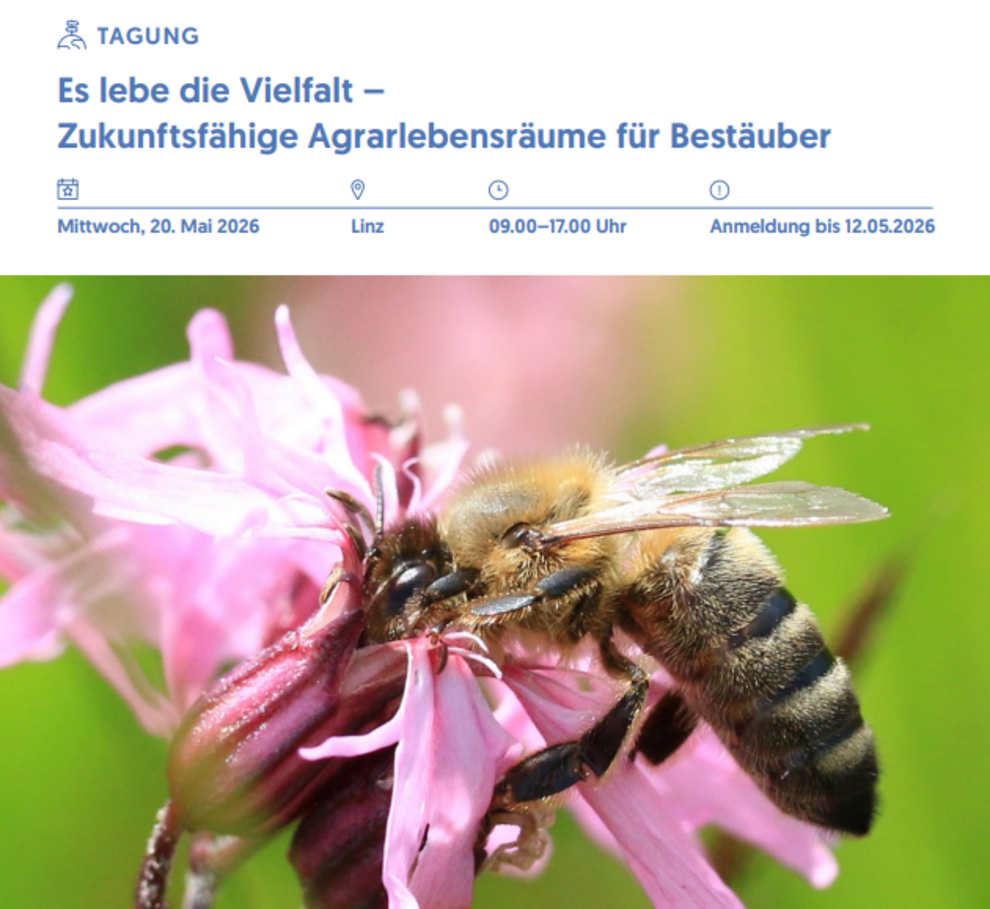 Wild- und Honigbienen, Hummeln, Schmetterlinge und andere Bestäuberinsekten sind nur dann langfristig überlebensfähig, wenn ihnen im gesamten Jahresverlauf ausreichend Nahrungsressourcen in Form von Pollen und Nektar zur Verfügung stehen. Entscheidend ist daher ein kontinuierliches Blütenangebot über die gesamte Vegetationsperiode hinweg – vom zeitigen Frühjahr bis in den Herbst. Das Bienenzentrum Oberösterreich, das Netzwerk Zukunftsraum Land und die Biene Österreich organisieren anlässlich des internationalen Weltbienentags am 20. Mai 2026 eine Fachveranstaltung zu dieser Thematik.