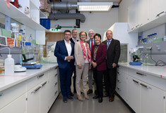 3 BilderTullns Bürgermeister Peter Eisenschenk, Peter Ertl (Vizerektor der TU Wien), Landeshauptfrau Johanna Mikl-Leitner, Otto Doblhoff-Dier (Vizerektor der Vetmeduni), BOKU-Rektorin Eva Schulev-Steindl und IFA Tulln-Departmentleiter Georg Gübitz (v.l.n.r.) in einem Labor des IFA Tulln anlässlich des Pressegesprächs. -
