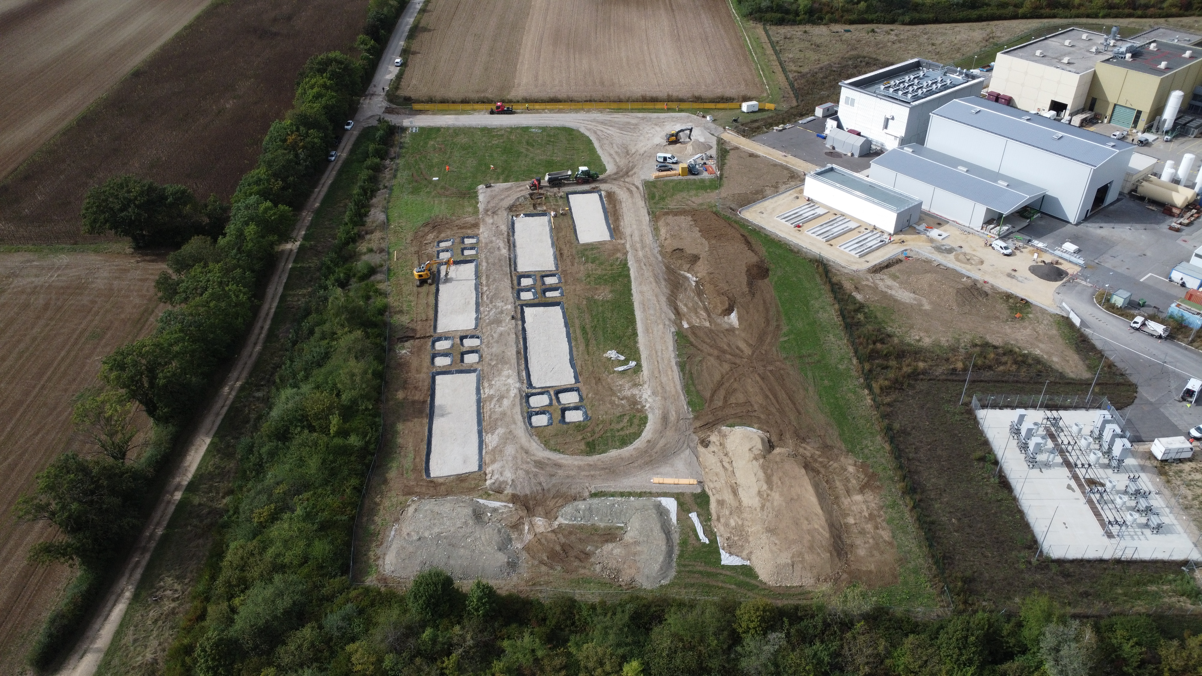 Beim Bau des OpenSkyLabs, September 2024. Um zwischen 2025 und 2027 verschiedene Wiederverwendungsfälle von Aushubmaterialien als konstruierte Böden zu testen, stellt das CERN eine Gesamtfläche von einem Hektar zur Verfügung. Ein Datenmanagementsystem integriert Informationen aus halbautomatisierten und manuellen Analysen sowie aus der automatisierten Boden- und Pflanzenüberwachung.