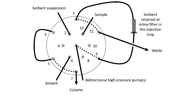Valve for renewable and inline solid phase extraction prior HPLC