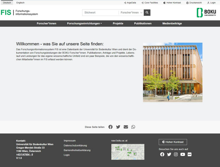 Das Forschungsinformationssystem FIS ist eine Datenbank der Universität für Bodenkultur Wien und dient der Dokumentation von Forschungsleistungen der BOKU Forscher*innen. Publikationen, Anträge und Projekte, Lebenslauf und Leistungen für das eigene wissenschaftliche Umfeld sind ein paar Beispiele, die von den wissenschaftlichen Mitarbeiter*innen im FIS erfasst werden können. Die erfassten Informationen werden vom FIS-Team laufend qualitätsgesichert und für verschiedenste interne und externe Anforderungen aufbereitet (z.B. Wissensbilanz, Ziel- und Leistungsvereinbarungen, Evaluationen). Ein vollständiges Forscher*innenprofil dient gleichzeit als Visitenkarte nach innen und außen.