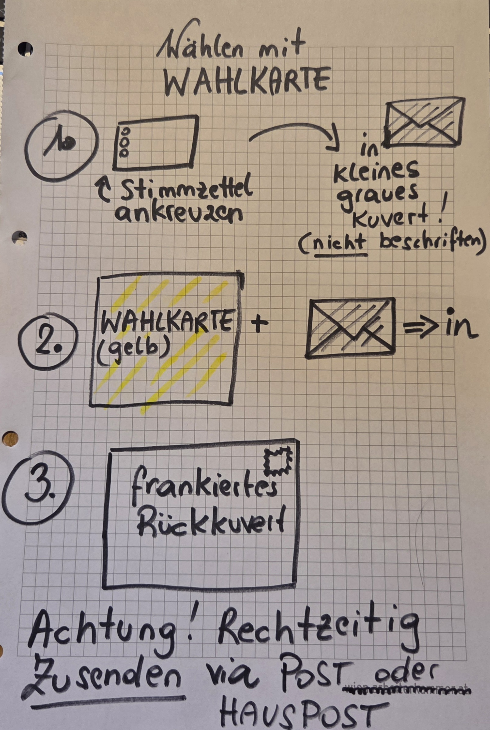 Briefwahl klingt immer recht kompliziert, deshalb ein kompaktes Tutorial HIER. Dadurch dass das graue Wahlkuvert unbeschriftet und damit anonym in das Rücksende kuvert gelangt (die gelbe Wahlkarte dient dazu dass der Wahlvorstand abhaken kann, von wem das Stimmkuvert übermittelt wurde und in das Wähler*innenverzeichnis eintragen), wird dieses auch genauso in die Abstimmungsurne eingeworfen wie alle anderen. Sie müssen sich also nie darum sorgen, dass klar ist “von wem die Stimme" kommt.