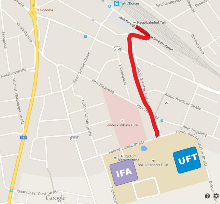 Fußweg vom Bahnhof "Tulln" (nicht "Tulln Stadt" - dieser Bahnhof fährt ins Stadtzentrum) zur BOKU (IFA und UFT)