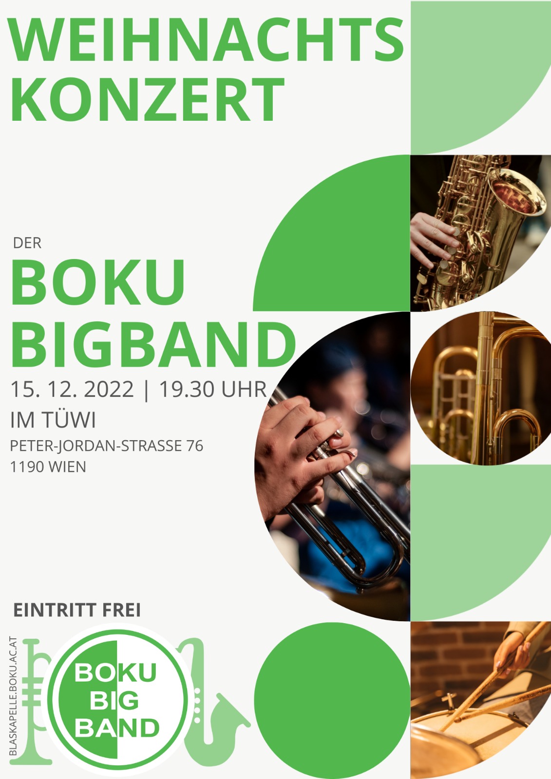 Am Donnerstag findet um 19:30 im TÜWI Beisl das Konzert der neu gegründeten BOKU Bigband statt. Sie werden euch mit jazzigen Weihnachtsstücken begeistern und freuen sich über euer kommen.