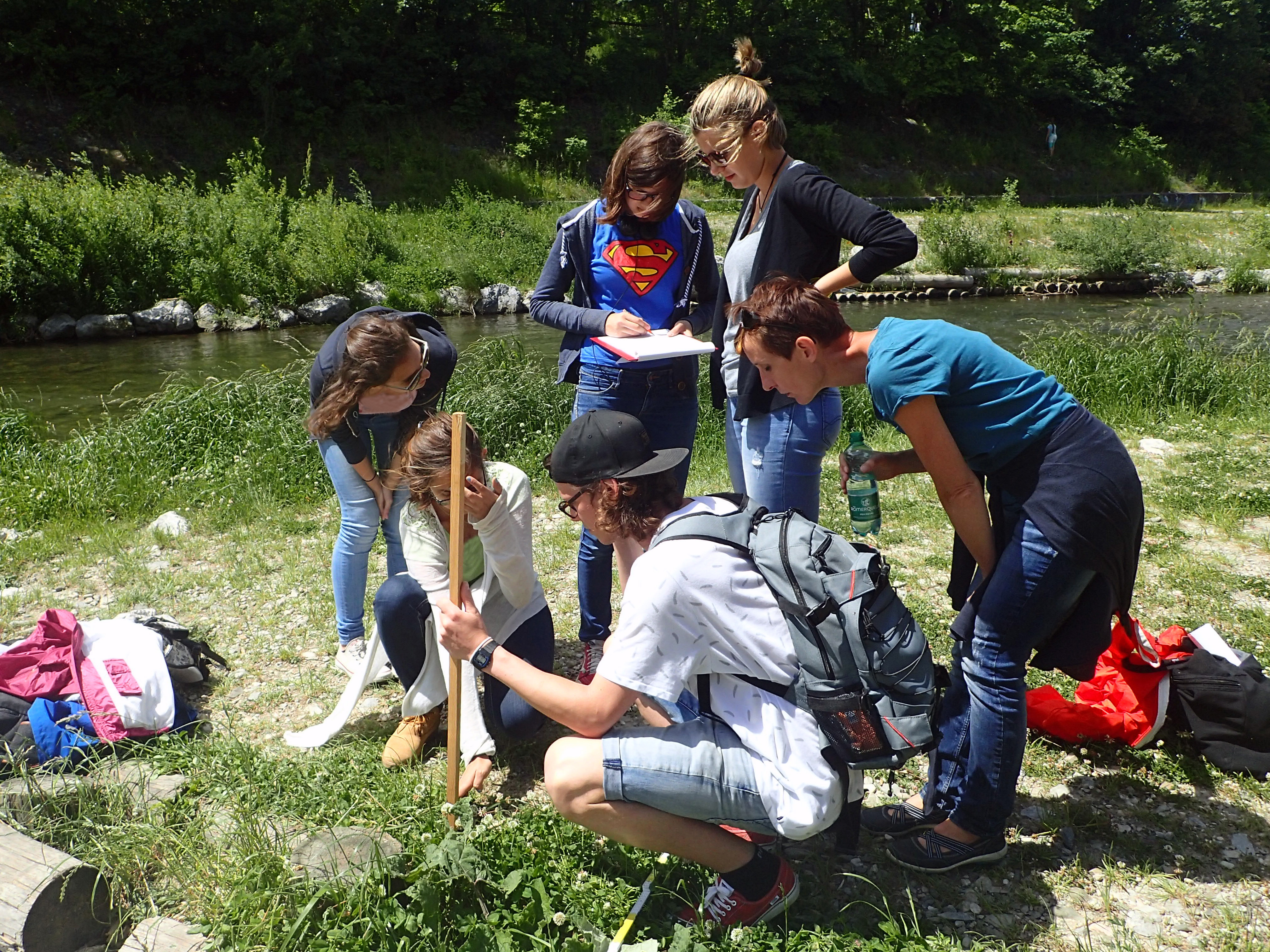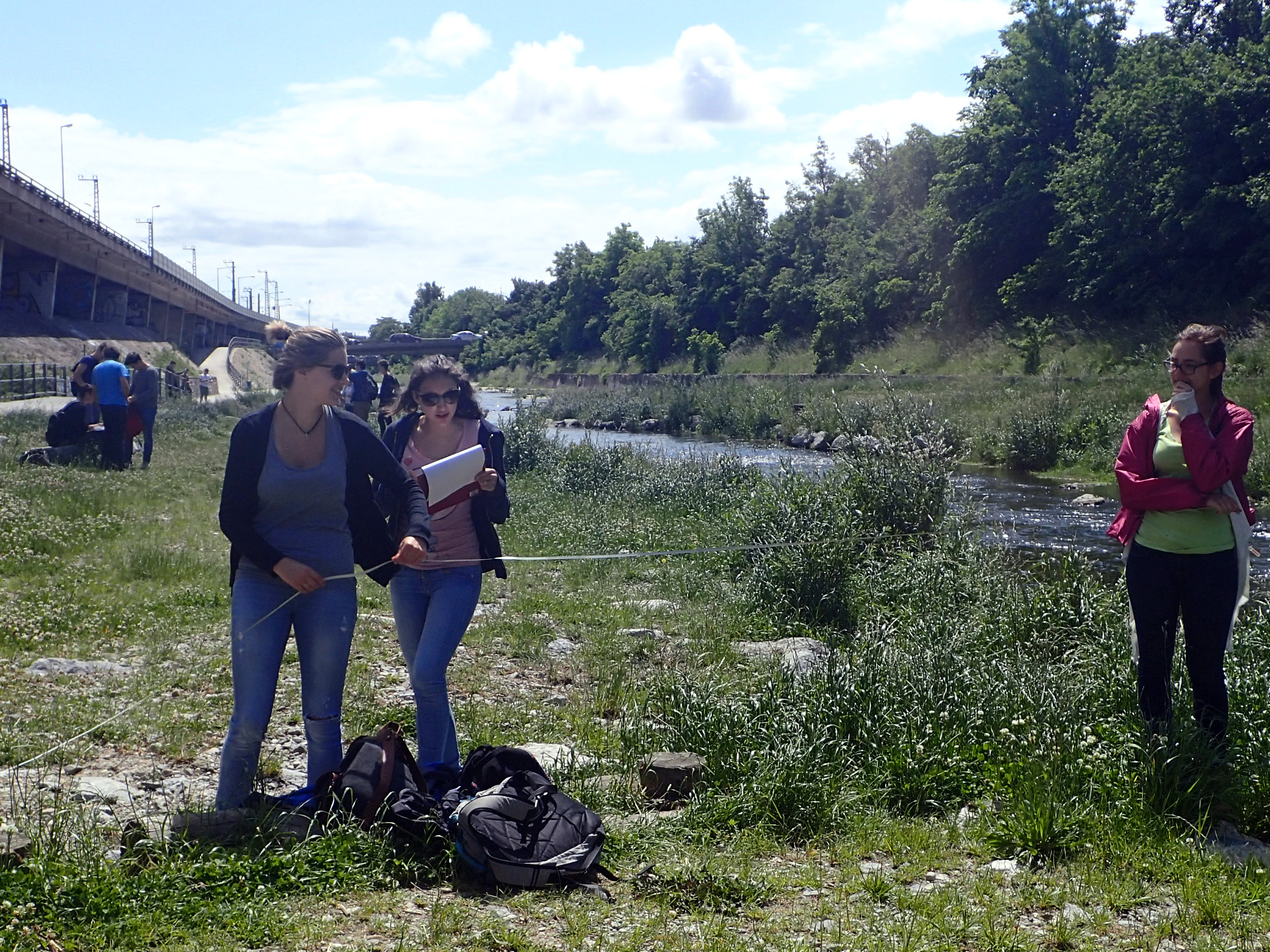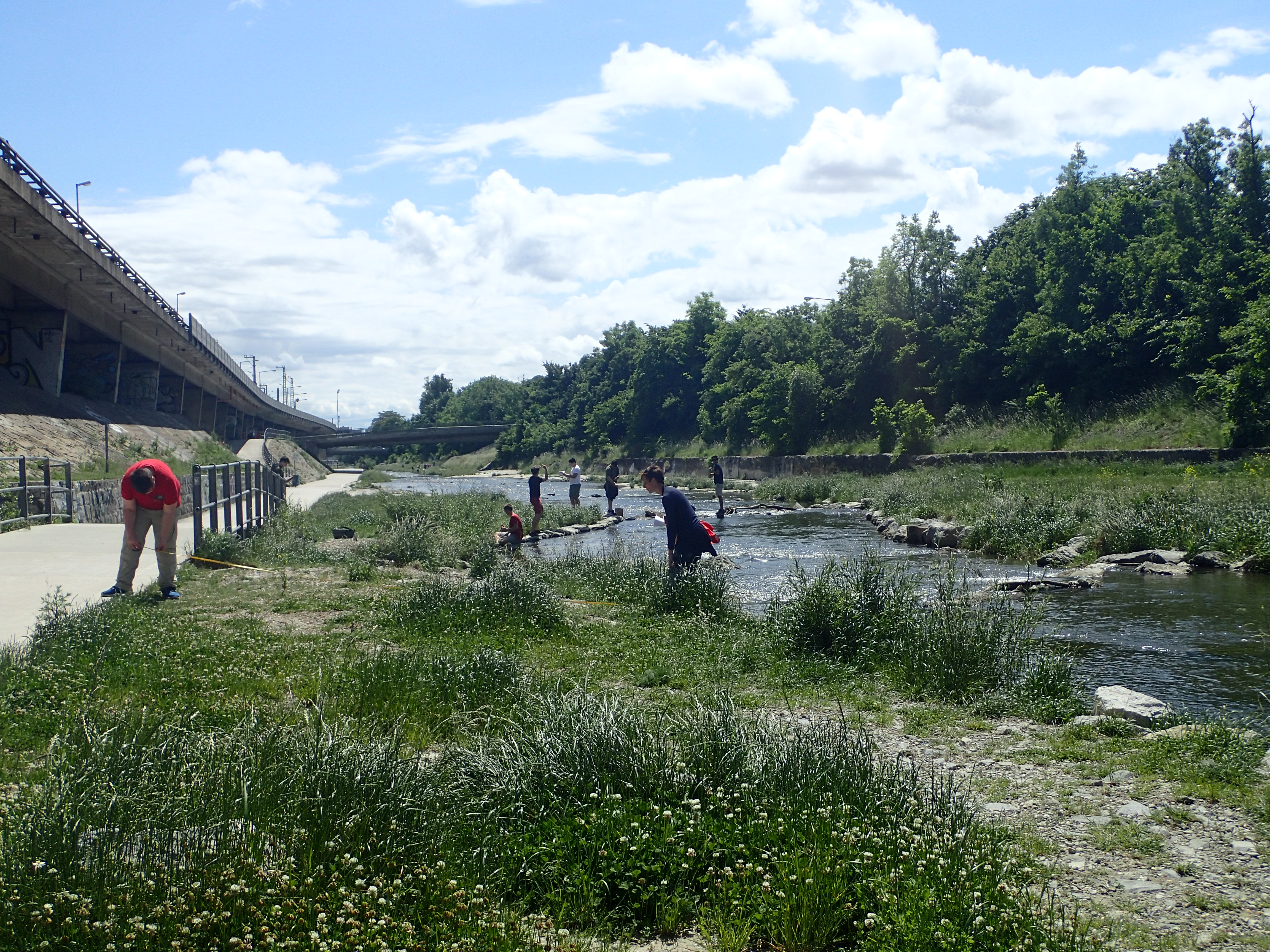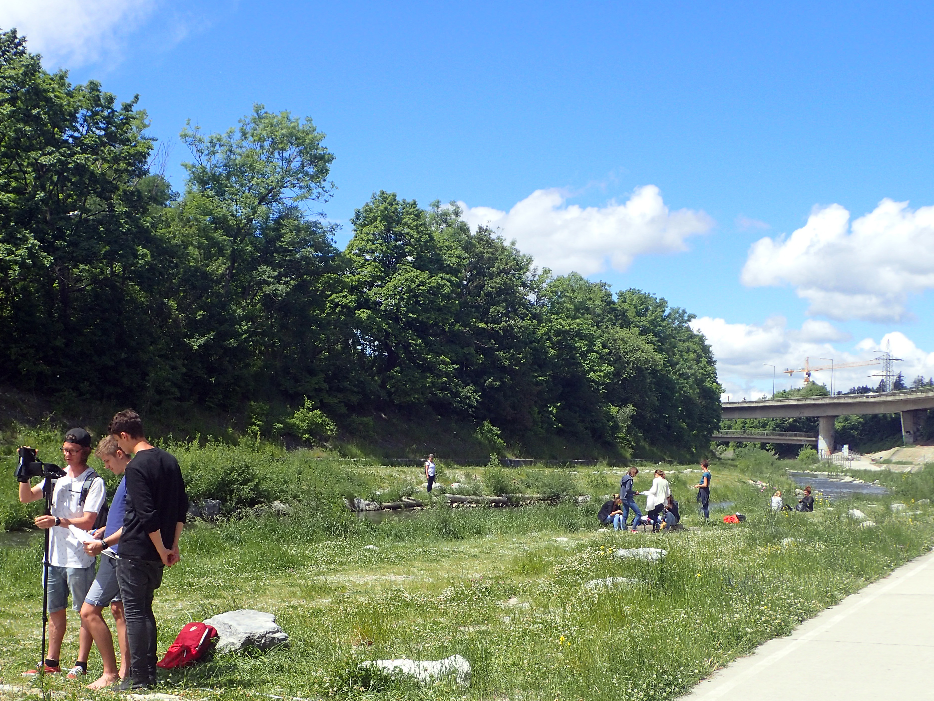 Als letzte Aktion in diesem Jahr nahmen die SchülerInnen an Messungen am Wienfluss Teil. Zu Beginn lernten sie die Wienflussaufsicht kennen und bekamen Infos zum Fluss und seiner Hochwasserschutzanlage. In Gruppen bearbeiteten sie dann Oberflächen verschiedenster Beschaffenheit im Flussprofil. Hier sollten die verschiedenen Oberflächentemperaturen bestimmt werden. Sie beschrieben die Standorte detailliert und machten zur Bestimmung der Oberflächentemperatur Aufnahmen mit der Wärmebildkamera. Die Lufttemperatur und Luftfeuchte wurde in verschiedenen Höhen gemessen. Bei den Messungen standen ihnen ein Student sowie Mitarbeiterinnen der BOKU zur Seite. In der Schule wurden diese Daten dann mit Hilfe des Programmes IR-Soft bearbeitet und analysiert.