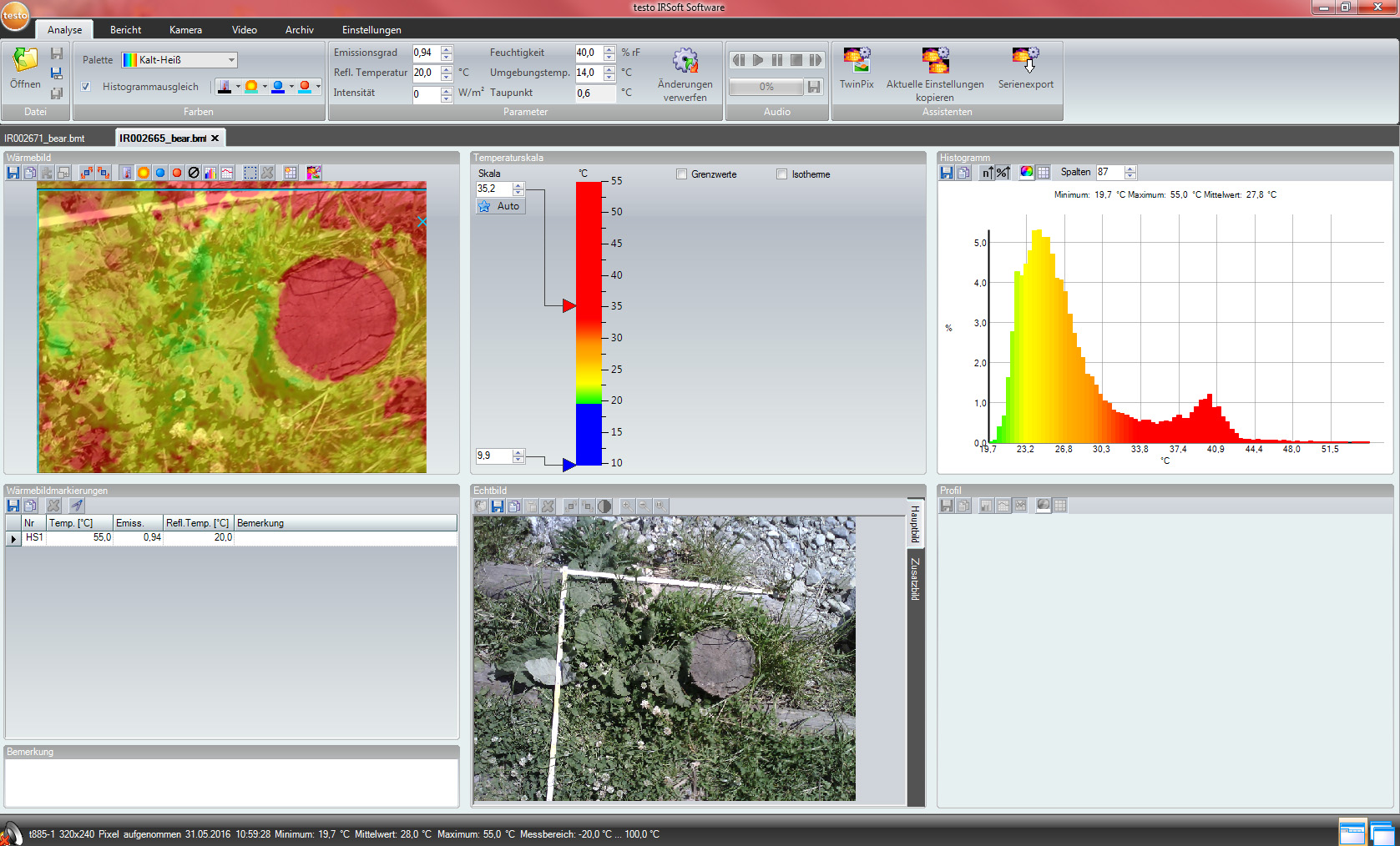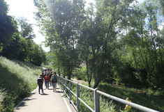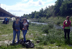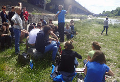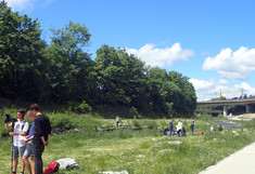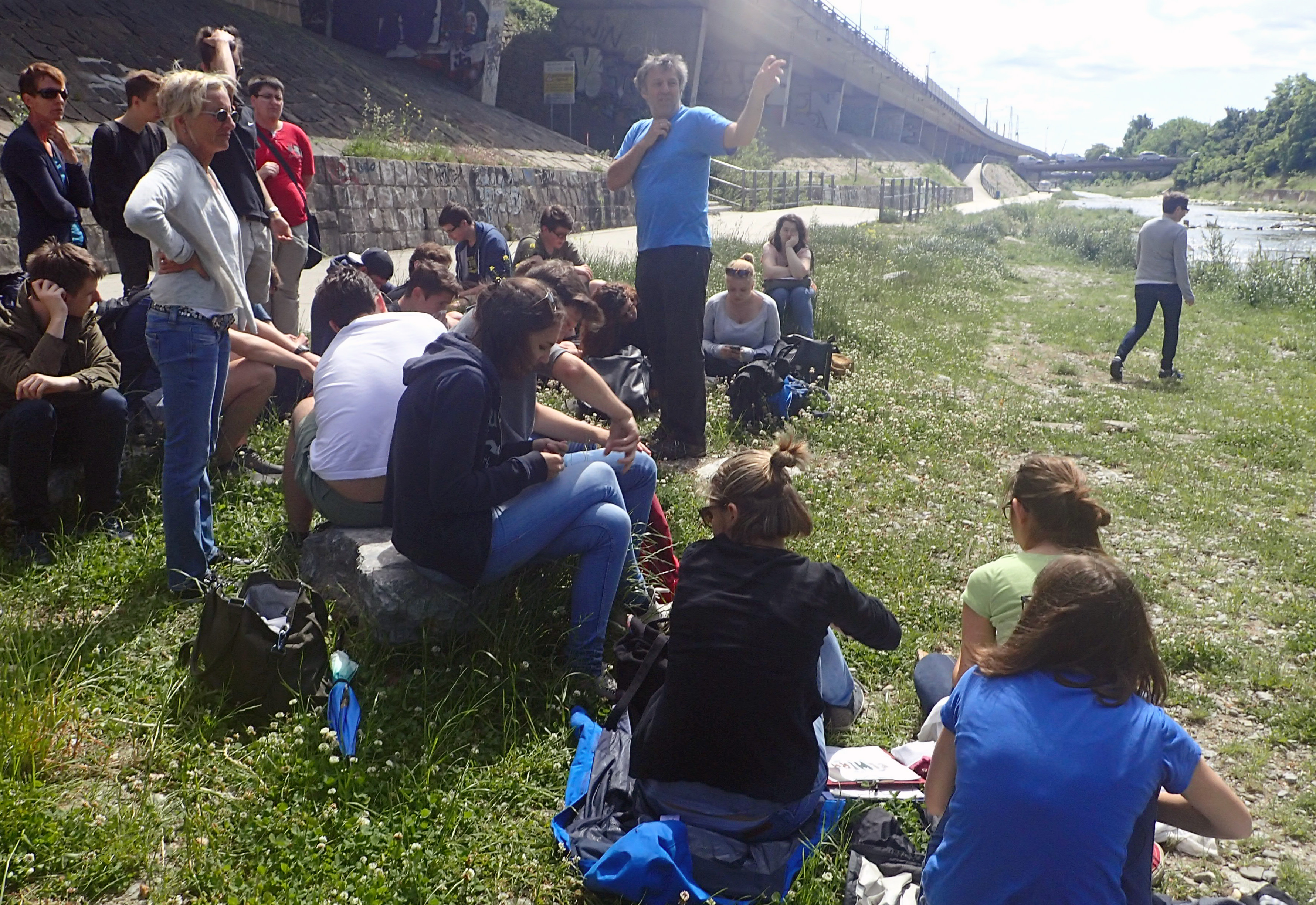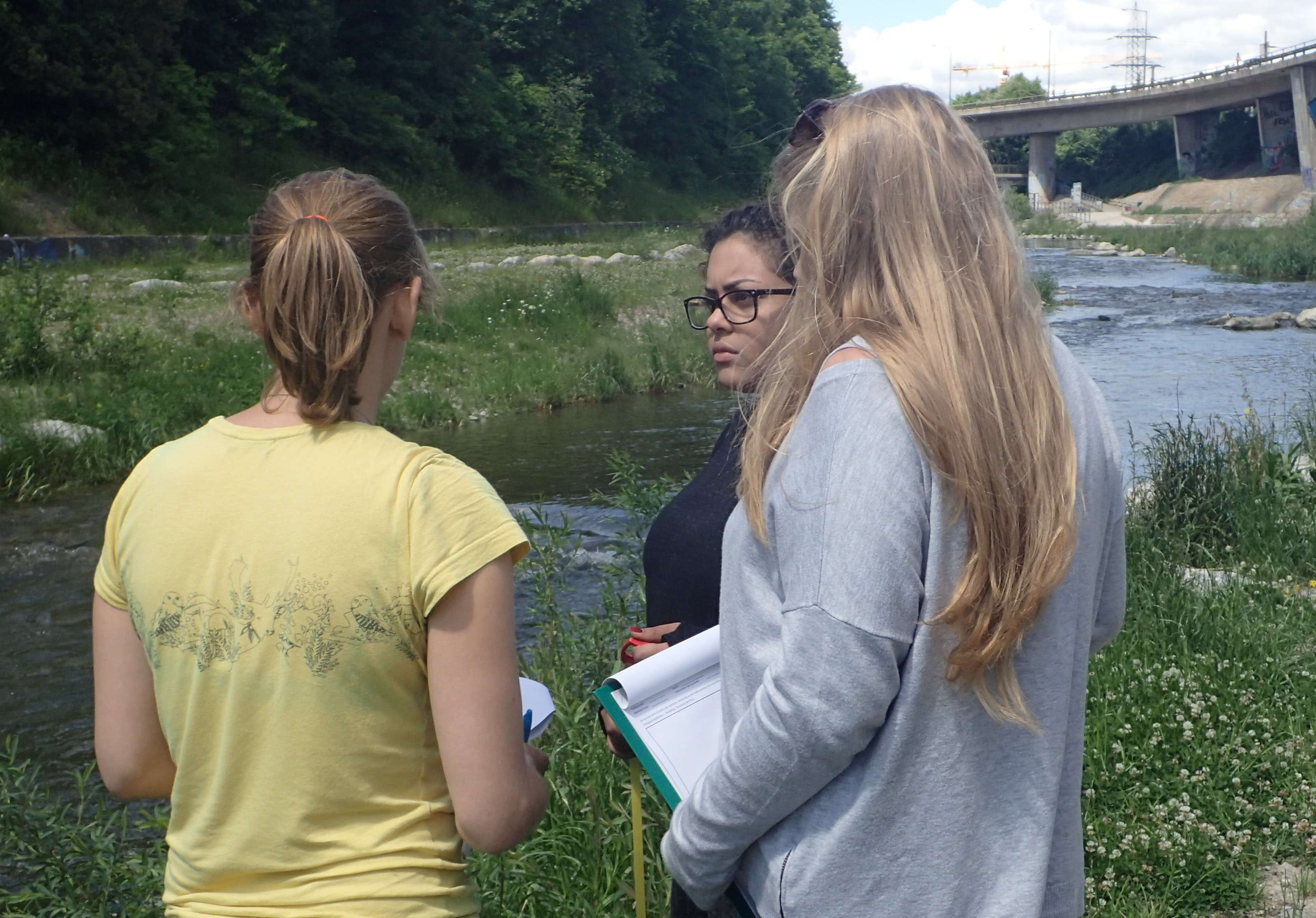Als letzte Aktion in diesem Jahr nahmen die SchülerInnen an Messungen am Wienfluss Teil. Zu Beginn lernten sie die Wienflussaufsicht kennen und bekamen Infos zum Fluss und seiner Hochwasserschutzanlage. In Gruppen bearbeiteten sie dann Oberflächen verschiedenster Beschaffenheit im Flussprofil. Hier sollten die verschiedenen Oberflächentemperaturen bestimmt werden. Sie beschrieben die Standorte detailliert und machten zur Bestimmung der Oberflächentemperatur Aufnahmen mit der Wärmebildkamera. Die Lufttemperatur und Luftfeuchte wurde in verschiedenen Höhen gemessen. Bei den Messungen standen ihnen ein Student sowie Mitarbeiterinnen der BOKU zur Seite. In der Schule wurden diese Daten dann mit Hilfe des Programmes IR-Soft bearbeitet und analysiert.
