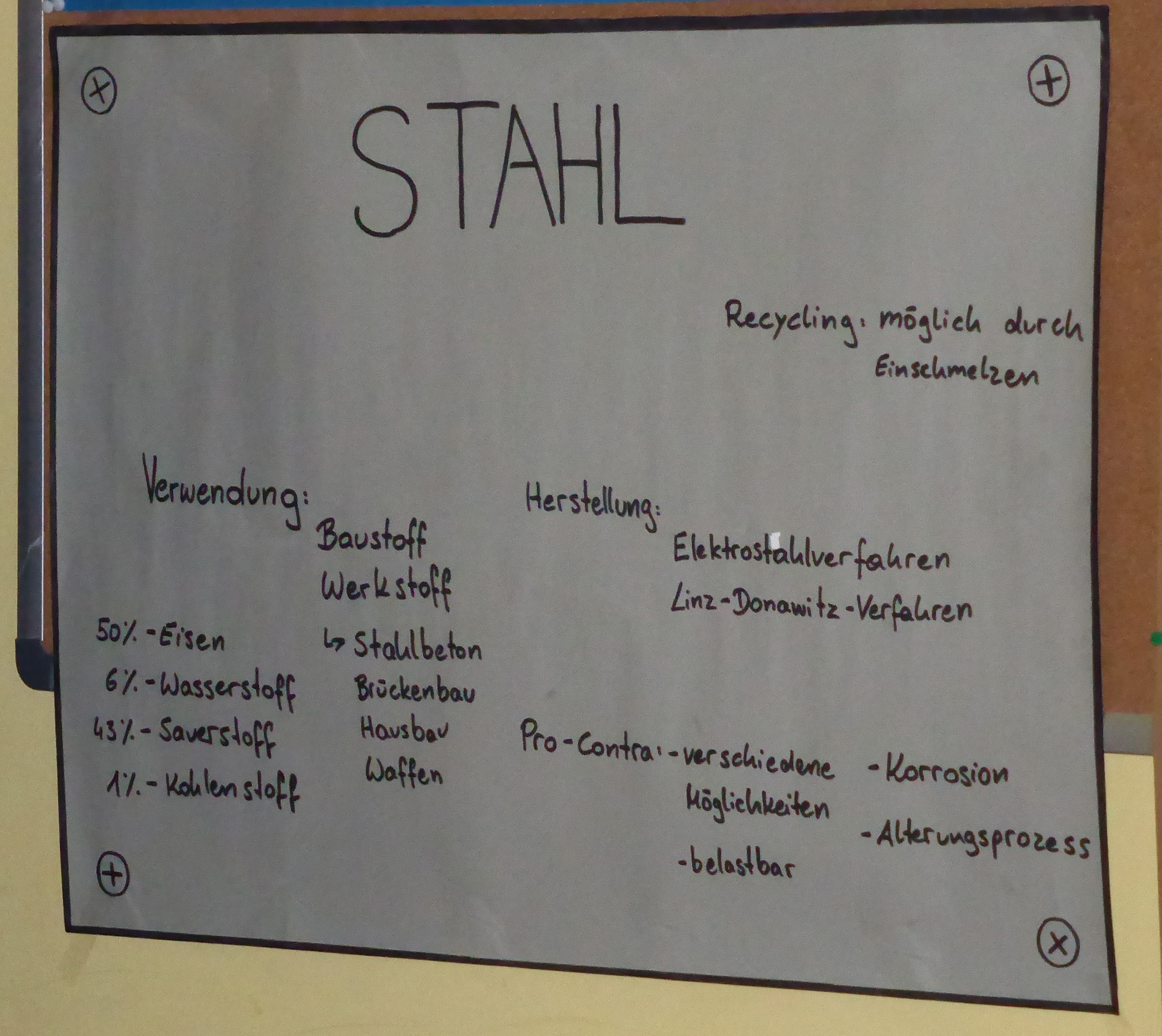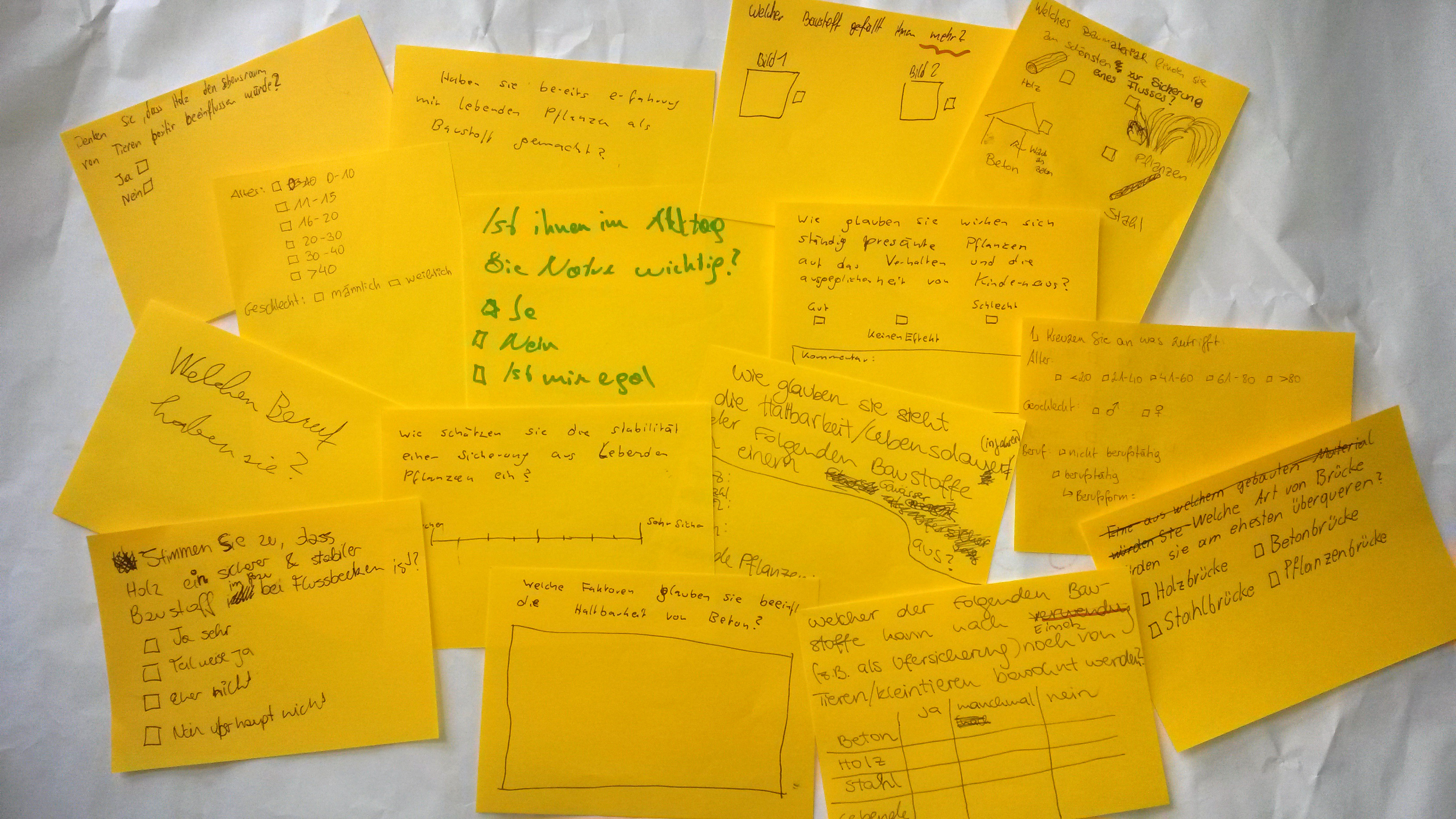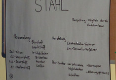Noch am Ende des Schuljahres vertieften wir uns gleich in das erste große Themengebiet des Projektes, die ästhetische Leistungsfähigkeit der Baustoffe Beton, Stahl, Holz und lebende Pflanzen. Gemeinsam überlegten wir wie man Anhand eines Fragebogens die ästhetischen Aspekte der Baustoffe bewerten kann. Als Stichworte dazu fielen die Schönheit, die Sicherheit welche diese ausstrahlen, der Eindruck der Haltbarkeit oder auch ob diese umweltfreundlich und nachhaltig erscheinen. Über den Sommer werden nun die gemeinsam erarbeiteten Fragen geordnet, ausformuliert und ergänzt, um im September mit den Befragungen zu beginnen zu können.