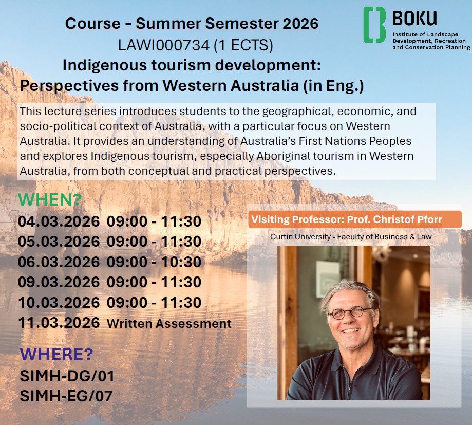This lecture series introduces students to the geographical, economic, and socio-political context of Australia, with a particular focus on Western Australia. It provides an understanding of Australia’s First Nations Peoples and explores Indigenous tourism, especially Aboriginal tourism in Western Australia, from both conceptual and practical perspectives.