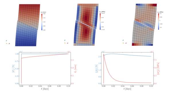 In particular we show in Figure 2 the viscoelastic behavior of a three-body system comprising of two elastic bodies on top and bottom and a viscoelastic interface layer. The three body system is subjected to a creep test by application of a constant nodal force on the top surface. We observe the viscous behavior developing on the displacement response of the top surface. We also observe the formation of a displacement jump due to the lower elasticity of the interphase layer. Moreover, we note the interplay of the viscous force due to the displacement jump and surface stress due to the surface viscoelasticity of the interphase layer.