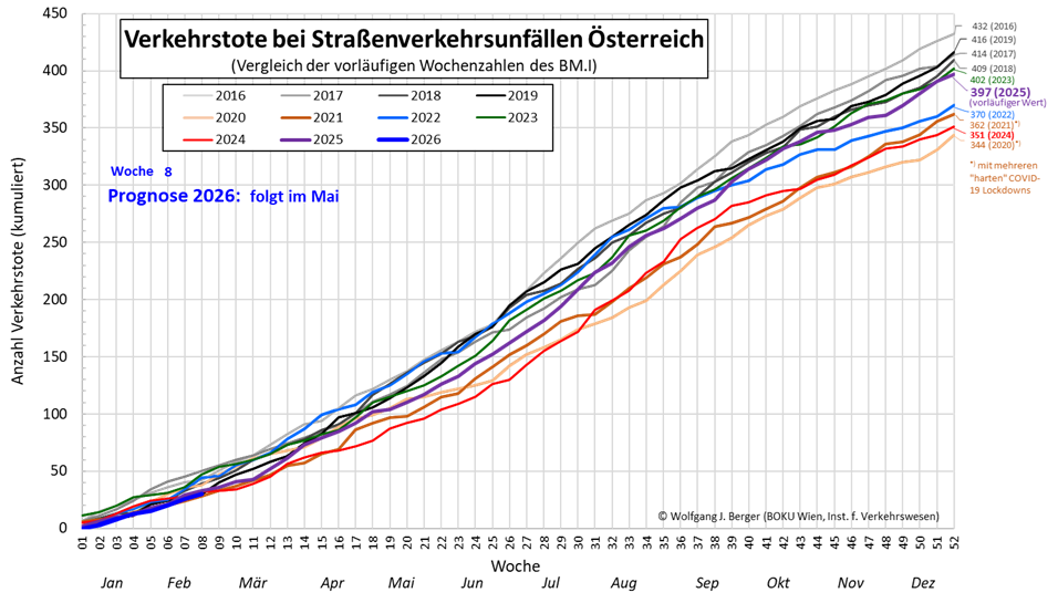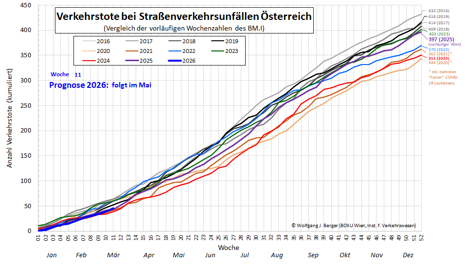 Als Datenbasis dient der jeweils zu Wochenbeginn vom Bundesministerium für Inneres verlautbarte aktuelle Stand der Anzahl der Verkehrstoten. Bei der Grafik handelt es sich um einen Vergleich der vorläufigen Zahlen, da die später an den Unfallfolgen Verstorbenen (30 Tage-Frist) während des Jahres erst nachträglich laufend hinzugefügt werden. Nach Jahresende geschieht dies rückwirkend, woraus der meist steile Anstieg in der jeweils letzten Jahreswoche hin zur Jahresendzahl resultiert. Die Prognose beruht auf den Wochenergebnissen seit 1.1.2009 bis zum Ende des Vorjahres.