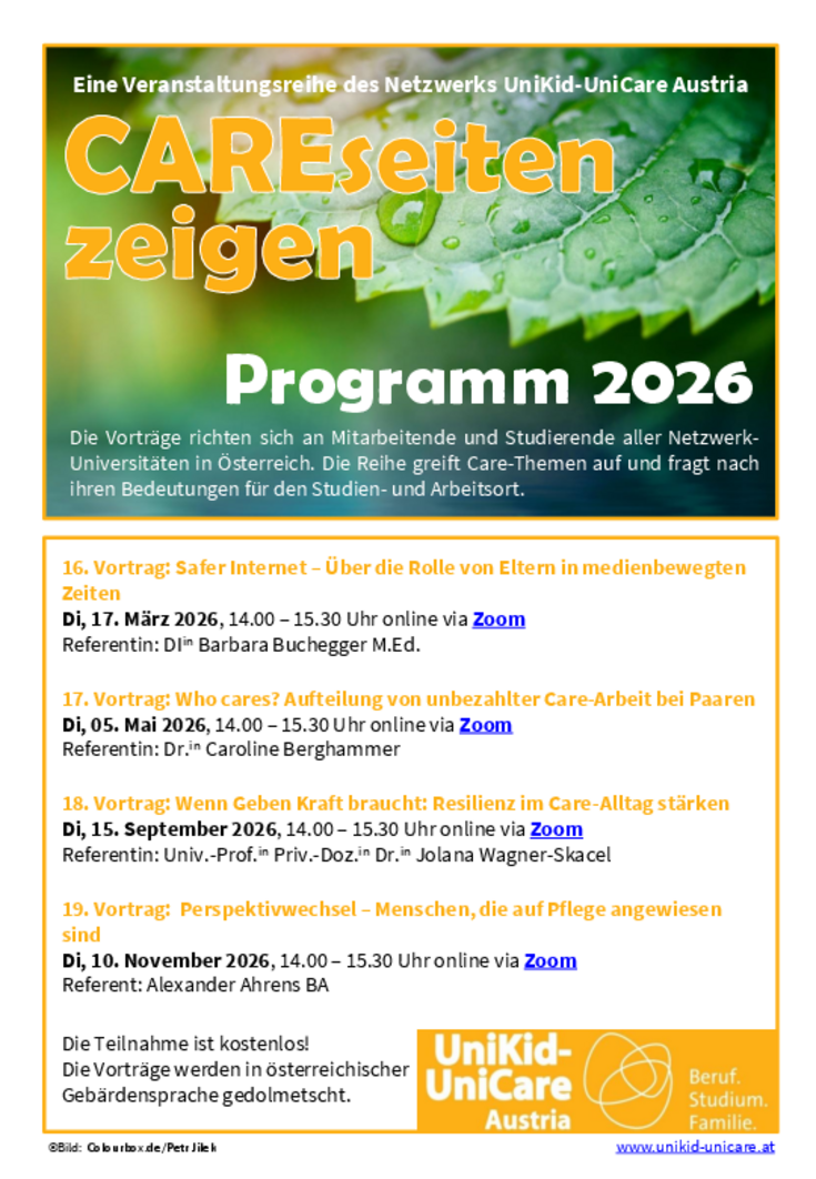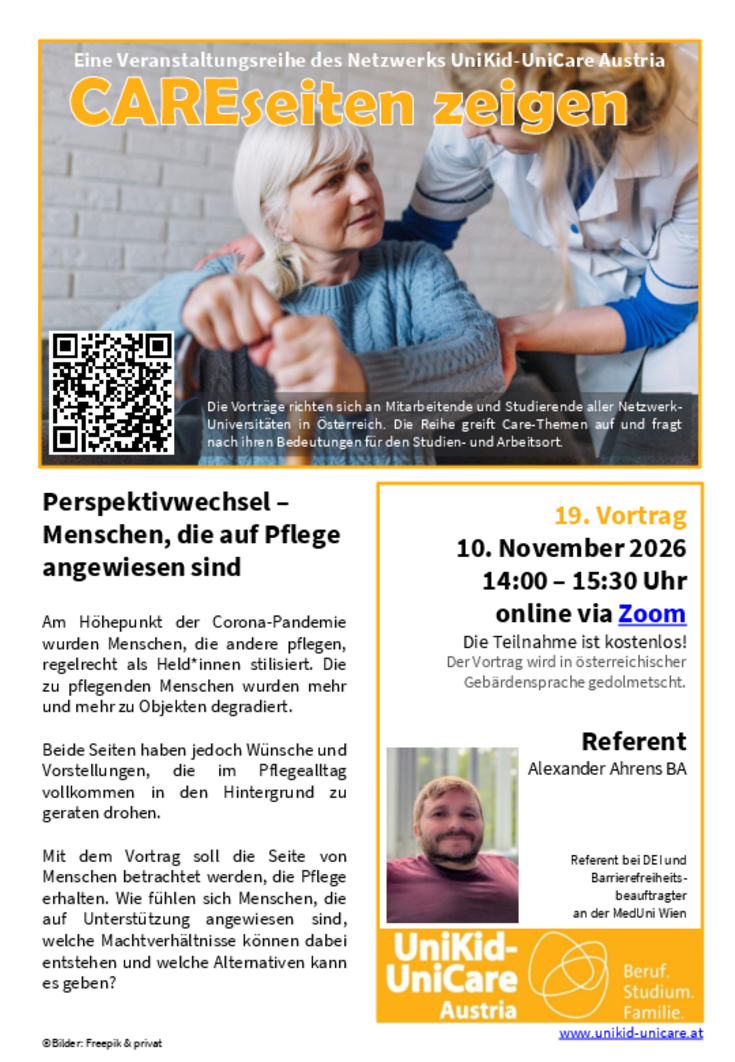 Am 13. Dezember 2023 fand der siebente Vortrag der online Veranstaltungsreihe „CAREseiten zeigen“ statt. Die Referentin für feministische Bildung und Politik und Expertin für Gender Studies und Feministische Forschung, Petra Unger, beleuchtete die Situation alleinerziehender Frauen in Österreich. Ausgehend von einem historischen Überblick in Form einer Lesung zeichnete sie vielfältige Bilder der Lebensrealitäten alleinerziehender Mütter bis in die Gegenwart: Ledige Dienstmädchen, Witwen, geschiedene oder nie verheiratete Frauen. Frauen, die sich trennen, um ihre Kinder zu schützen.