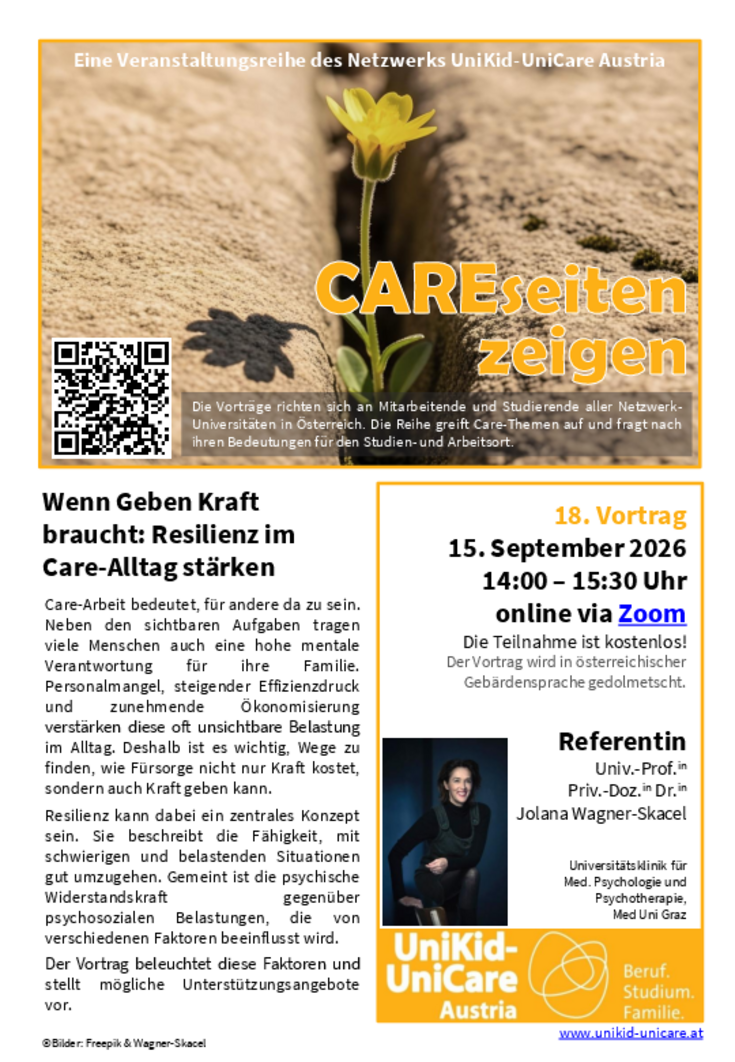 "Geistig fit bis ins hohe Alter?! Wie kann uns das Gelingen?" Dieser Frage ging die Psychologin und Demenzforscherin Prof.in Marisa Koini am 23. April 2024 im Rahmen der achten Veranstaltung der Reihe CAREseiten zeigen des Netzwerks UniKid-UniCare nach.