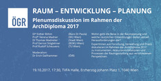 Wohin geht die Reise in der Raumplanung und welche räumlichen Entwicklungen stellen aktuell Herausforderungen dar? ExpertInnen aus Forschung, Verwaltung und Praxis diskutieren im Rahmen der ArchDiploma 2017 zu Instrumenten, Akteurskonstellationen und Prozessen der Raumgestaltung aus verschiedenen Perspektiven. DIin Esther Böhm (Büro Dr Paula)