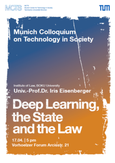 Talk: "Deep Learning, the State and the Law", Prof. Iris Eisenberger, University of Natural Resources and Life Sciences, Vienna Date & Time: 17 April 2018, 5pm Loction: Vorhoelzer Forum, Arcisstr. 21, D-80333 München You can find further information on the MCTS's homepage.