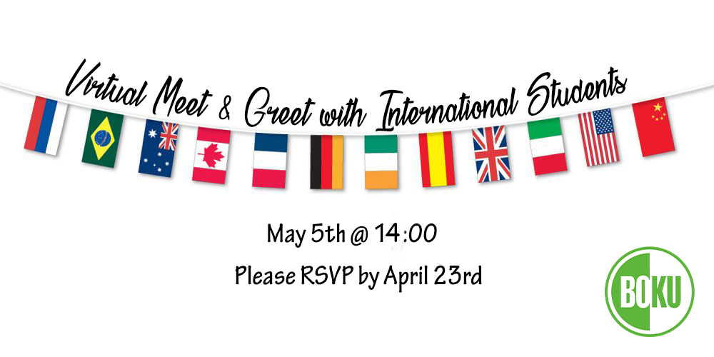 Are you an international student studying at BOKU? We are looking for YOU – Present your country/university at the “Virtual Meet & Greet” and enjoy a social afternoon! Present some nice pictures and ideas to discuss student life.