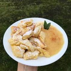 Separate two eggs and beat the whites until stiff. Add to the yolks 25 grams of sugar, 125 grams of flour and 150 millilitres of milk. Mix that and fold in the beaten egg whites. Put some oil in a pan and add the dough. Once the bottom is golden brown, turn the dough and break it into small pieces. Serve the Kaiserschmarren with powdered sugar and fruit puree and enjoy. Mahlzeit!
