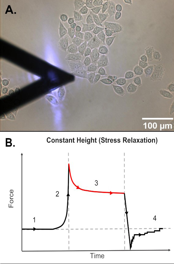 In this work we show, taking the advantage of the viscoelastic properties of HeLa cells, how to perform stress relaxation experiments. In particular, we have exposed the cells to several external forces (1, 2, 4, and 8 nN) during different pause times (1, 10, and 60 s). The manuscript discuss which linear viscoelastic models can be used to fit the experimental data, being the best five element Maxwell model. This primer in microscopy serves as an introduction and guide when performing stress relaxation experiments on soft materials using AFM. The work is part of the long-term collaboration of the members of the Institute of Biophysics with Rafael Benitez (Faculty of Economy of the University of Valencia).