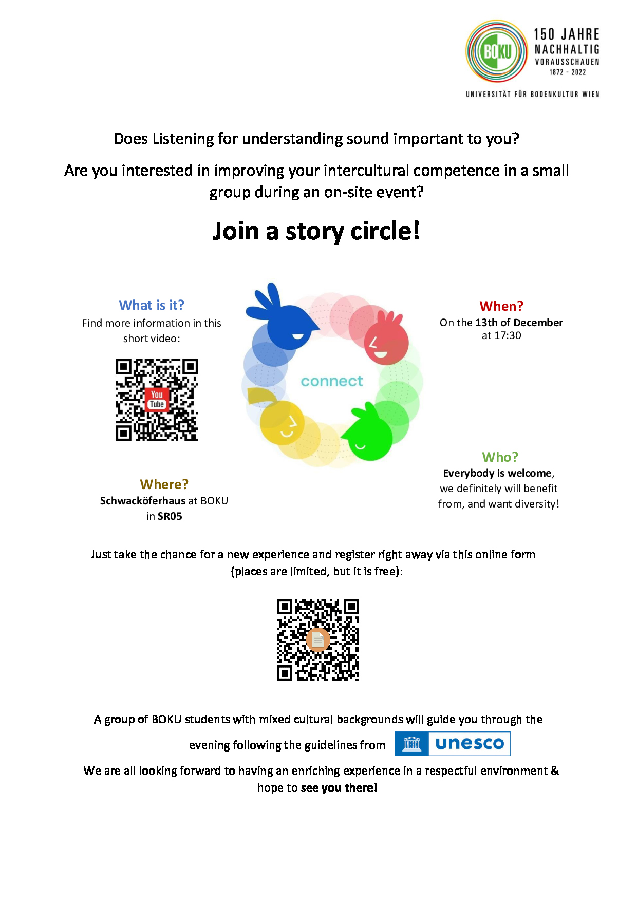 Are you interested in improving your intercultural competence against stereotyping in a small group? Join a story circle at BOKU on 13 December at 5.30pm (SR05, Schwackhöferhaus). Become a change-maker and learn to be more inclusive and understand others.