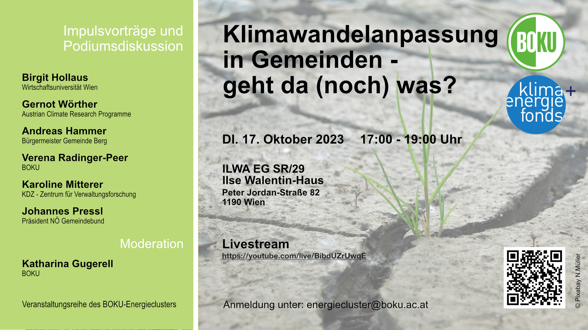 Diskutiert werden durch den Klimawandel verursachte Risiken aber auch Handlungsmöglichkeiten, rechtliche Spielräume und die Finanzierung der Umsetzungsmöglichkeiten in den Gemeinden.
