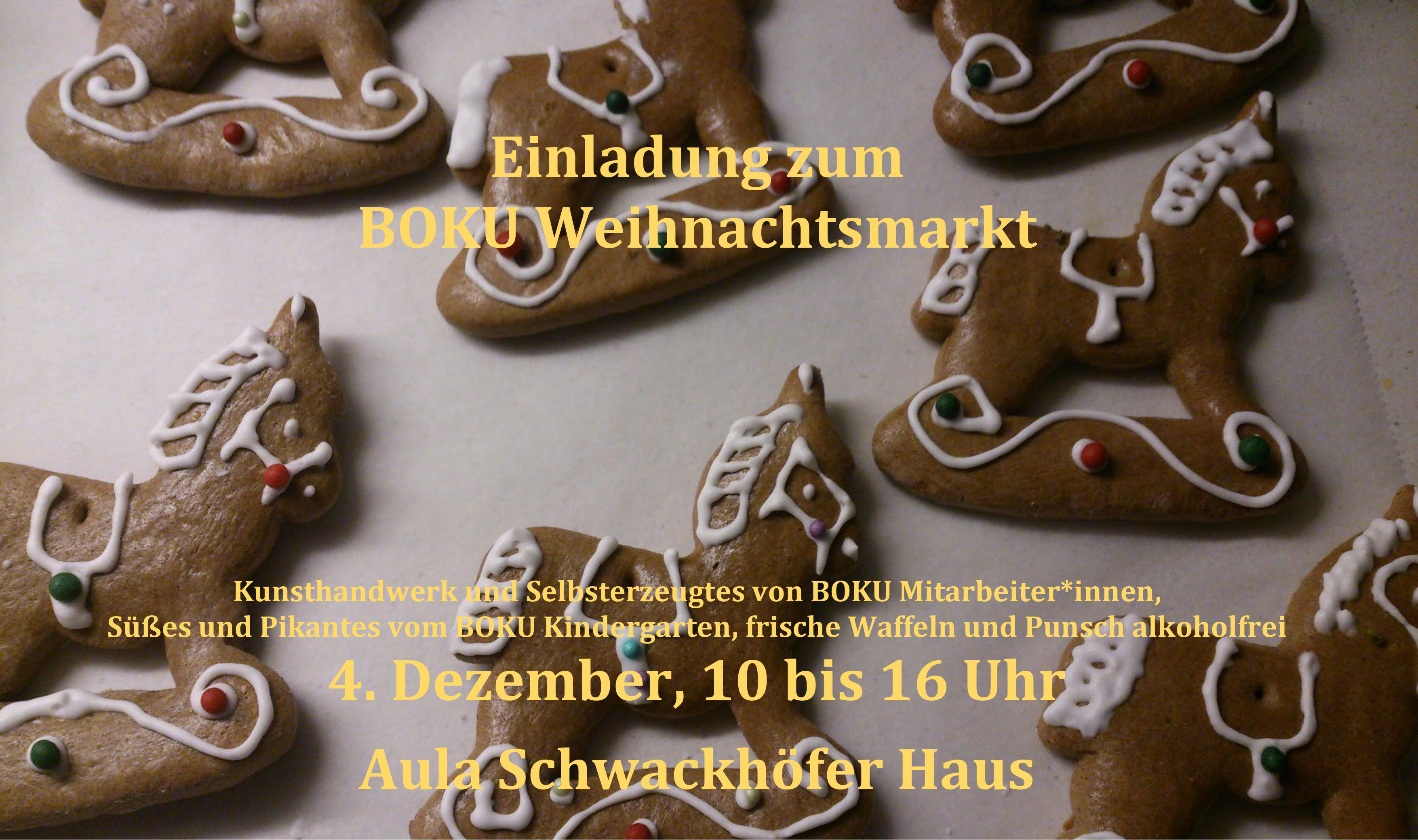 Heuer wird die Aula des Schwackhöferhauses nach mehrjähriger Pause endlich wieder zum kleinen Weihnachtsmarkt. Mitarbeiter*innen haben für Mitarbeiter*innen eifrig gewerkt, um Kunstvolles, Handwerkliches oder Kulinarisches anzubieten. Sicher finden Sie das eine oder andere Gechenk für Ihre Liebsten. Es werden auch wieder frische Waffeln gebacken. Wir freuen uns sehr wenn Sie vorbeischauen!